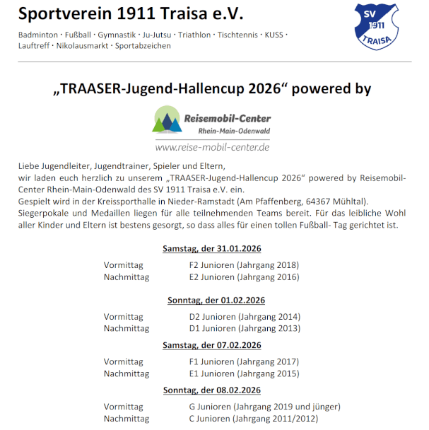 wir laden euch herzlich zu unserem „Traaser-Jugend-Hallencup 2026“ powered by Reisemobil-Center Rhein-Main-Odenwald des SV 1911 Traisa e.V. ein.
