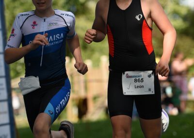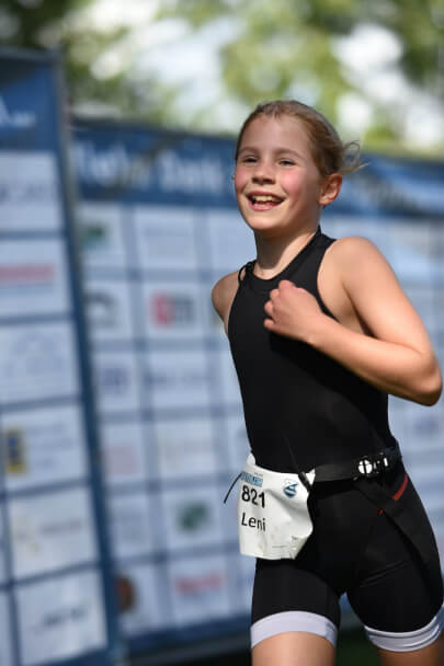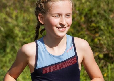 Von der kleinen Schwester angefeuert startete Nele Hein bei den Schülerinnen A mit der zweitschnellsten Schwimmzeit ins Rennen. Dicht beieinander verließen die drei Führenden Athletinnen kurz darauf die Wechselzone in Richtung Radstrecke wo sich Nele aber deutlich absetzen konnte. „Ich habe Nele in den letzten Wochen während der Wettkampfvorbereitung erlebt und war mir sicher, dass sie auf dem Rad kaum zu halten sein wird“ zollt Jugendtrainer Jan Keller der Entwicklung höchsten Respekt während Nele bereits dem Ziel entgegenläuft und ihren Sieg gebührend bejubeln lässt.